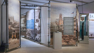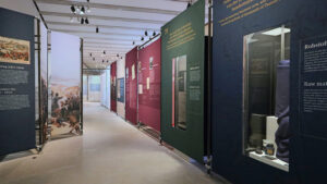 Interaktive Exponate, Wandvitrinen, Textildrucke/Wandbespannungen, textile Wandverkleidungen mit Interaktionsklappen, Ausstellungsmöbel, Shopmöbel